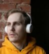 A close-up of a person typing on a keyboard, with a professional microphone and a pop filter prominently positioned in the foreground. Nearby, a pair of headphones rests on the desk. The scene suggests a podcast or audio recording setup.